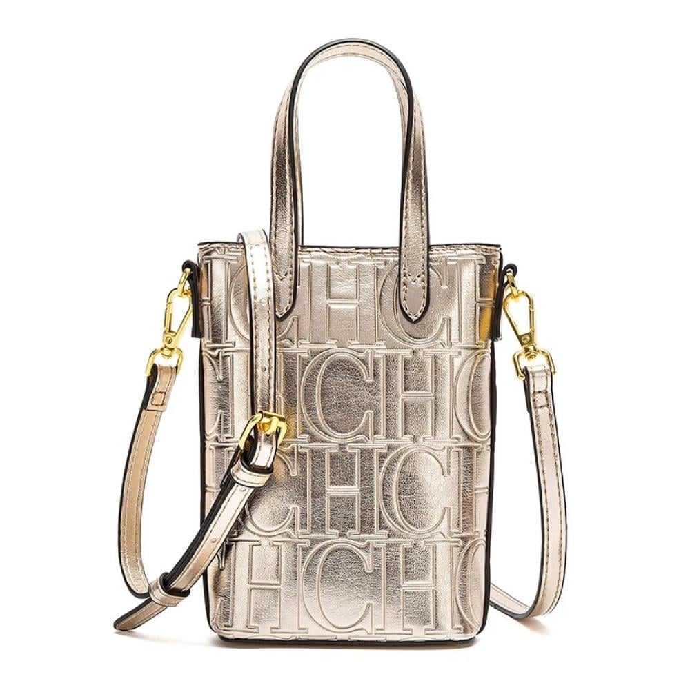 حقيبة هاتف نسائية من CHCH 2025 باللون الذهبي الخفيف، مصنوعة من جلد لامع عالي الجودة. تصميم أنيق وفاخر، مثالي لحمل هاتفك ومستلزماتك الصغيرة مع لمسة من الفخامة.